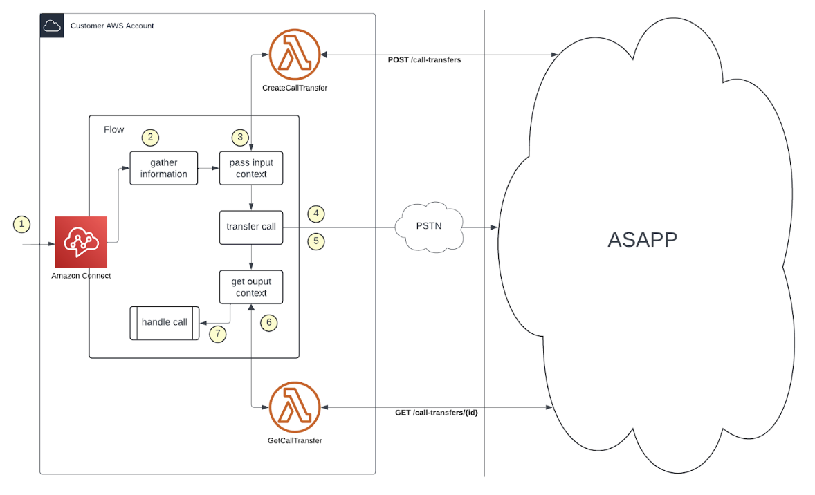 - Request a number: Amazon Connect invokes a Lambda function to request a phone number from ASAPP to transfer the call to.
